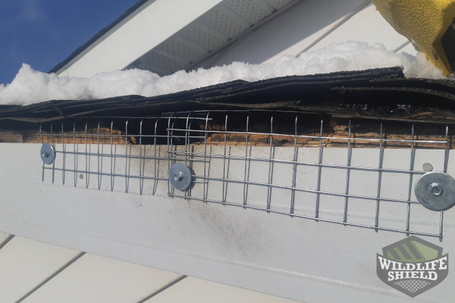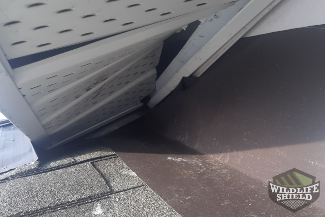 First, the one-way door was installed on the soffit. To make it fit, the technician surrounded the roof-soffit intersection with mesh, then added in the door. This would let the squirrel out safely, on its own terms. No trapping or direct contact required.