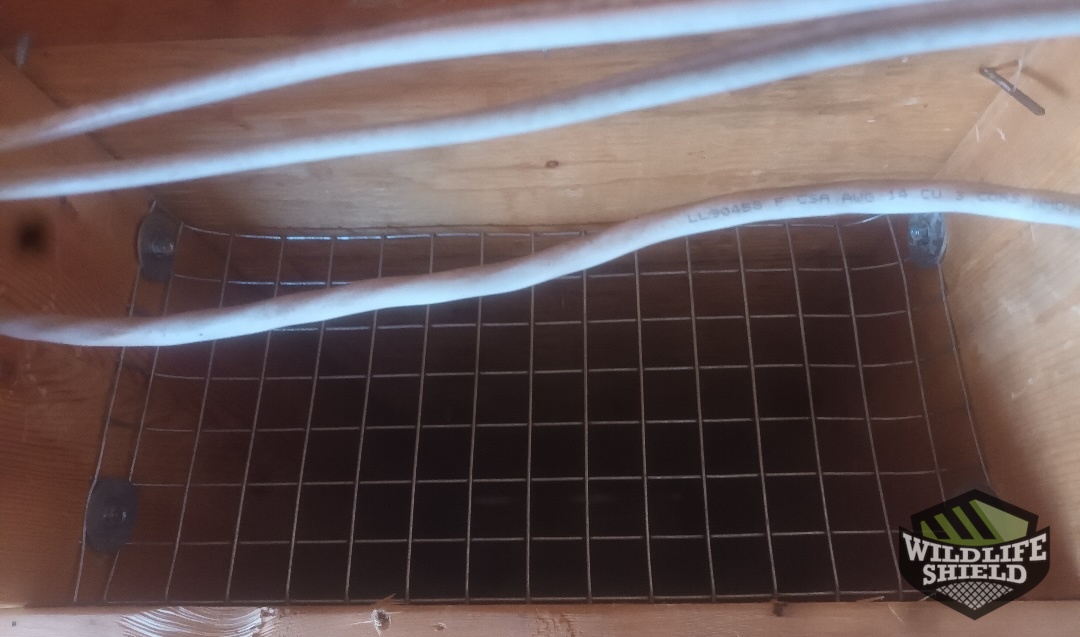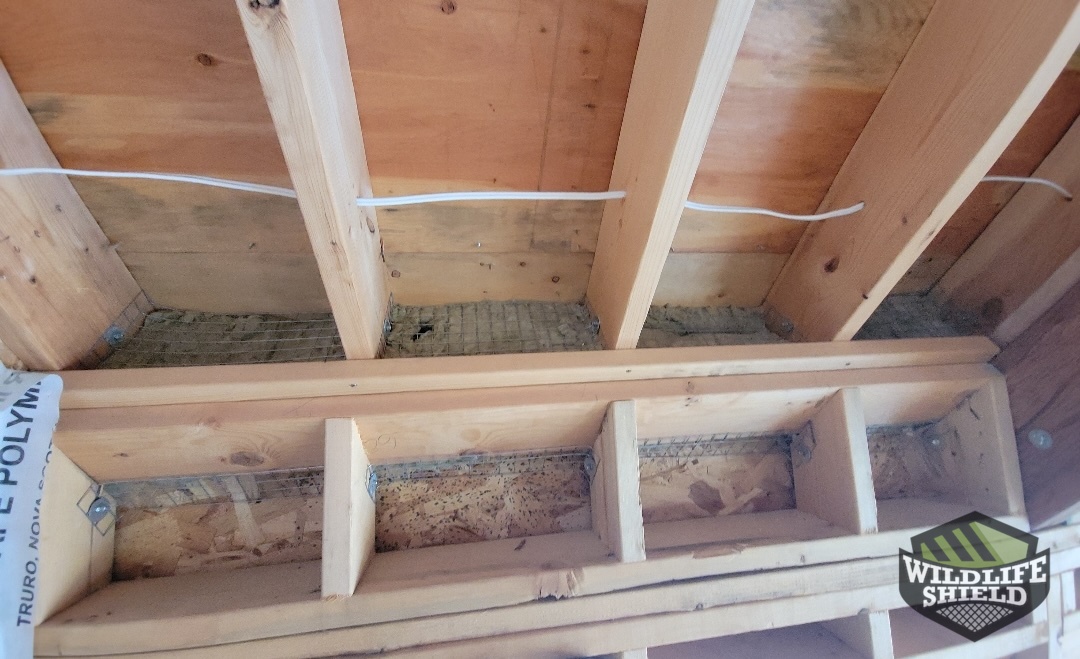 The technician sealed off the area the squirrel was using to build its nest with a galvanized steel cage and a one way door. The squirrel was not present at the time, at least visibly but due to the fact that squirrels are protected wildlife a door must be installed for safety purposes. Other areas of the decks underside where excluded to prevent squirrels from accessing the houses interior and to prevent further nesting. The roof was also excluded including twenty four feet of soffit exclusion. Another area squirrel are likely to penetrate.