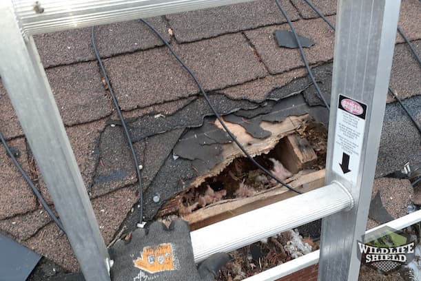 Given the squirrel activity and the size of the hole in the roof, the technician on site believed that a raccoon made the hole, but that a squirrel was using it as well. Like squirrels, raccoons are attracted to attics for their warmth, height above ground, and safety from predators. It was also springtime when female squirrels and raccoons need a place to raise their young.